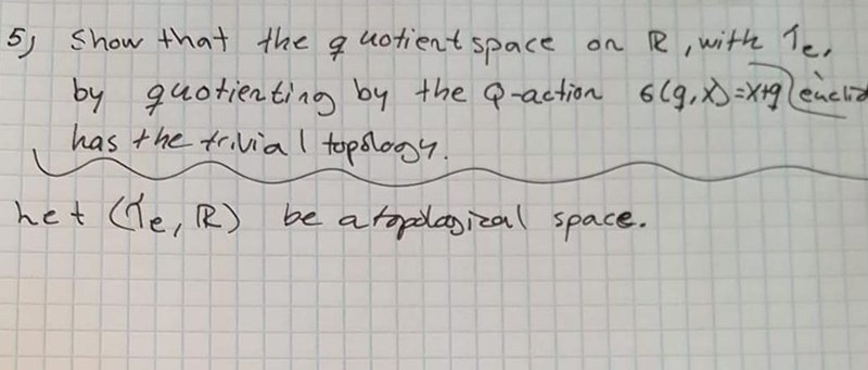 Detta är min uppgift och min fina början till lösning. Sen tog det stop. Jag tänker, kan man se Q som en ekvivalensrelation och se quotientspace uppbyggt av delmängder av R/Q?