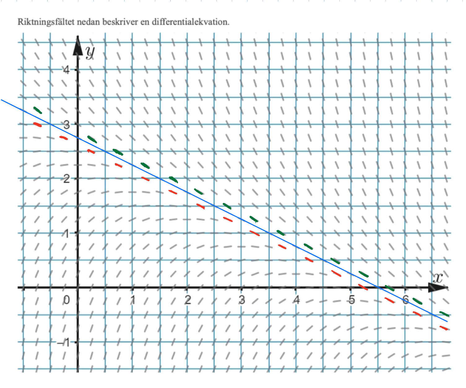 Det gäller att finna de"järnfilspån" som bildar en rät linje. Detär oftast bäst att försöka finna de "spån" som "tvingar upp" (röda) och "tvingar ned" (gröna) en imaginär linje. Se det som strömmar i ett hav som skulle tvinga en båt i en viss riktning. Det är inte alltid lätt att finna den exakta linje som facit önskar, men de är ofta ute efter förståelsen, inte att du får exakt samma värden som de.