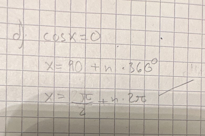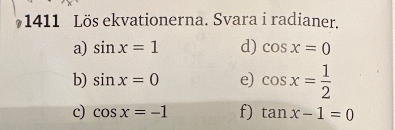 likaså på d) så fick jag x=(π/2)+n•2π