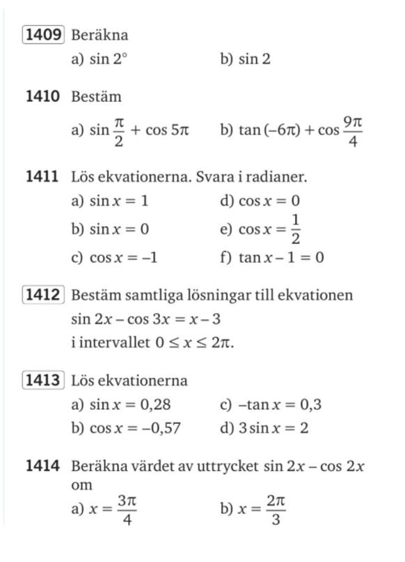 Du skall beräkna sin2˚. Ställ in din räknare på grader och beräkna sinus av 2. Sedan, på b), ställer du in räknaren på radianer och beräknar sinus av 2. Jämför resultaten och titta på enhetscirkeln.