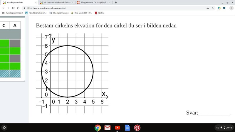 Medelpunkten har väl koordinaterna (2,3)? Fast hur tar jag reda på radien utifrån den informationen?