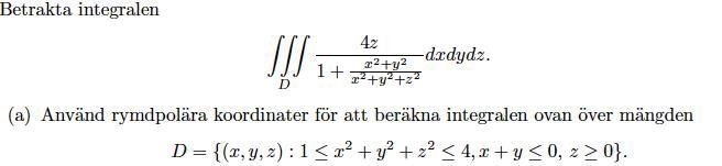 Edit: Jag hann se förut att det stod 1 < x2+y2+z2 < 4 (eller kanske likheter också), men inget om [1,2]. Tog du det från facit? Det där är en sfär med radien 2, med sfären med radien 1 borttagen inuti.