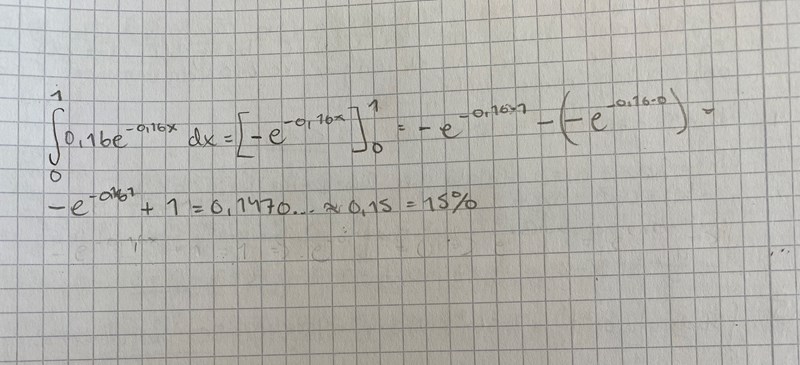 Hur ska jag göra? Tänkte att jag kunde sätta in värdena i funktionen och få ut svaret, dvs f(1)=0,16•e^(-0,16•1)=0,13634... vilket är fel!