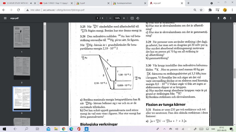 Det första sönderfallet här leder till en Hg med minimal energi, och den sägs vara i grundtillståndet. I de båda andra fallen får man en Hg med extra energi, och de kan avge den extra energin så de kommer till närmast lägre energi, som man ser med gamma-pilarna.