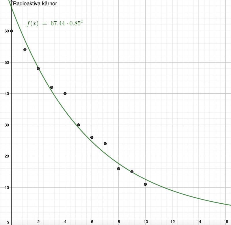 Från GeoGebra får vi en exponentialfunktion y=C*ax där C är antalet radioaktiva kärnor från början, a är förändringsfaktorn och x är tiden.