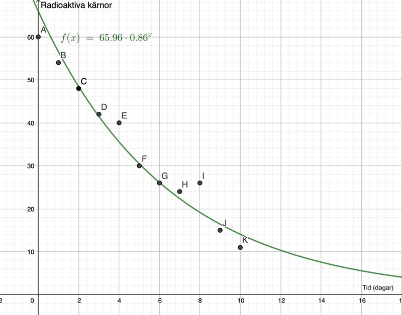 - Ange det algebraiska funktionsuttrycket för kurvan som GeoGebra tagit fram. Är denna typ av kurva en typisk modell för radioaktivt sönderfall? Använd funktionsuttrycket för att bestämma ett värde på kärnornas halveringstid.