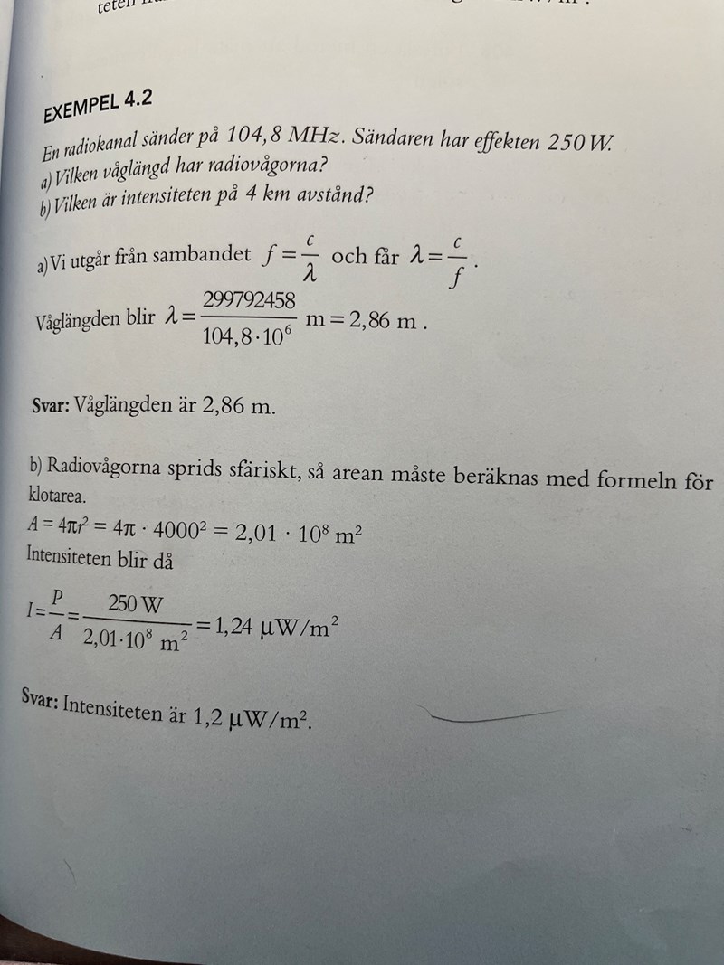 Hej! I exempel 4.2 b räknar man arean med formeln för klotarea. Jag undrar varför de räknar med att radiovågorna sprids sfäriskt? Och vad innebär detta att radiovågor sprids sfäriskt? Och varför gör de det?