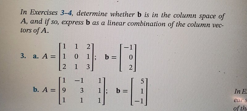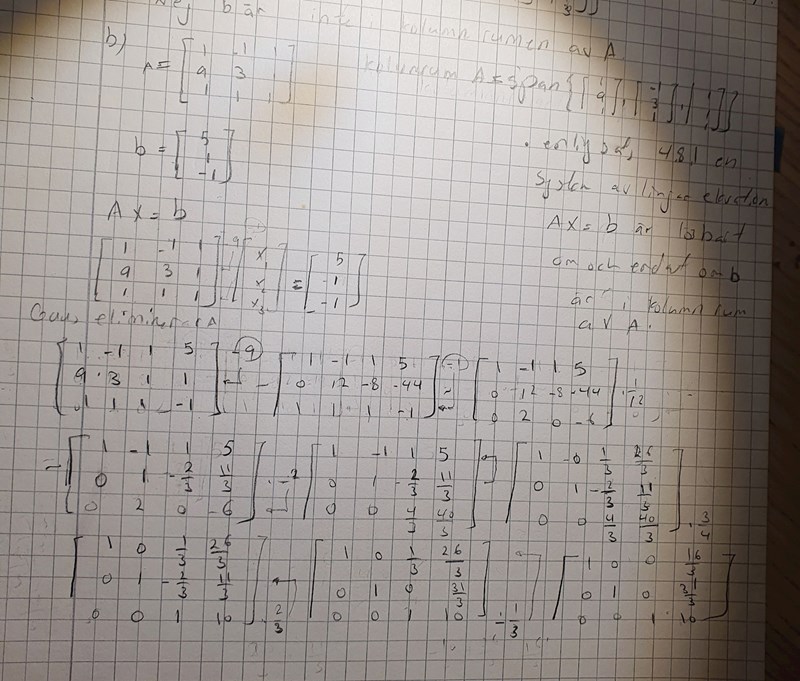 Jag hade först bestämt en bas för kolumnrummet. Därefter hade jag sett om det går att bilda vektorn b som linjärkombination av basen.
