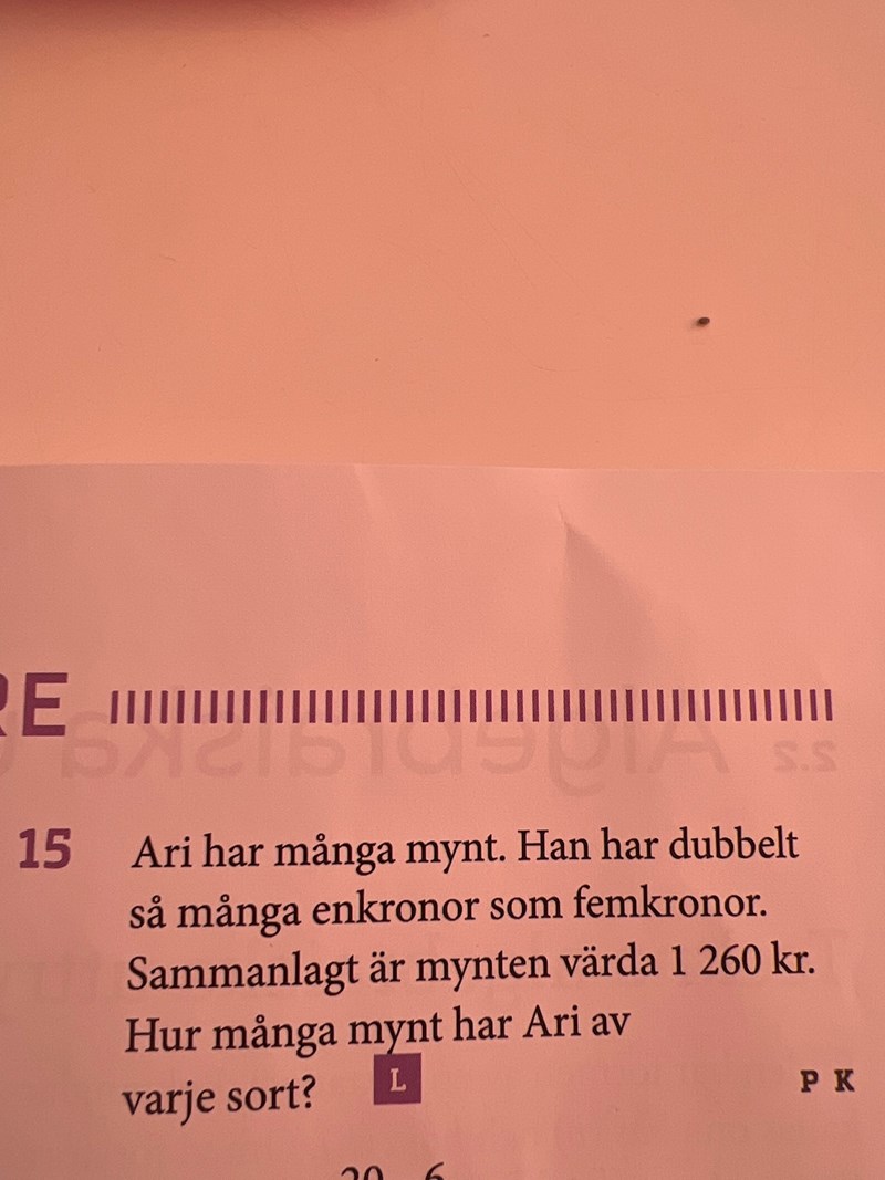 Jag skulle fokusera på värdet som enkronorna tillsammans och femkronorna har för sig. Vi säger att x är antal femkronor, och vi har dubbelt så många enkronor som femkronor. Då får vi att 2x = antal enkronor. Nu kan vi ta antalet enkronor och femkronor gånger värdet på mynten för att få fram totala värdet för enkronorna och femkronorna separat. Det totala värdet för enkronorna är 2x*1kr, och det totala värdet för alla femkronor är x*5kr. Sammanlagt ska de ha värdet 1260 kr: