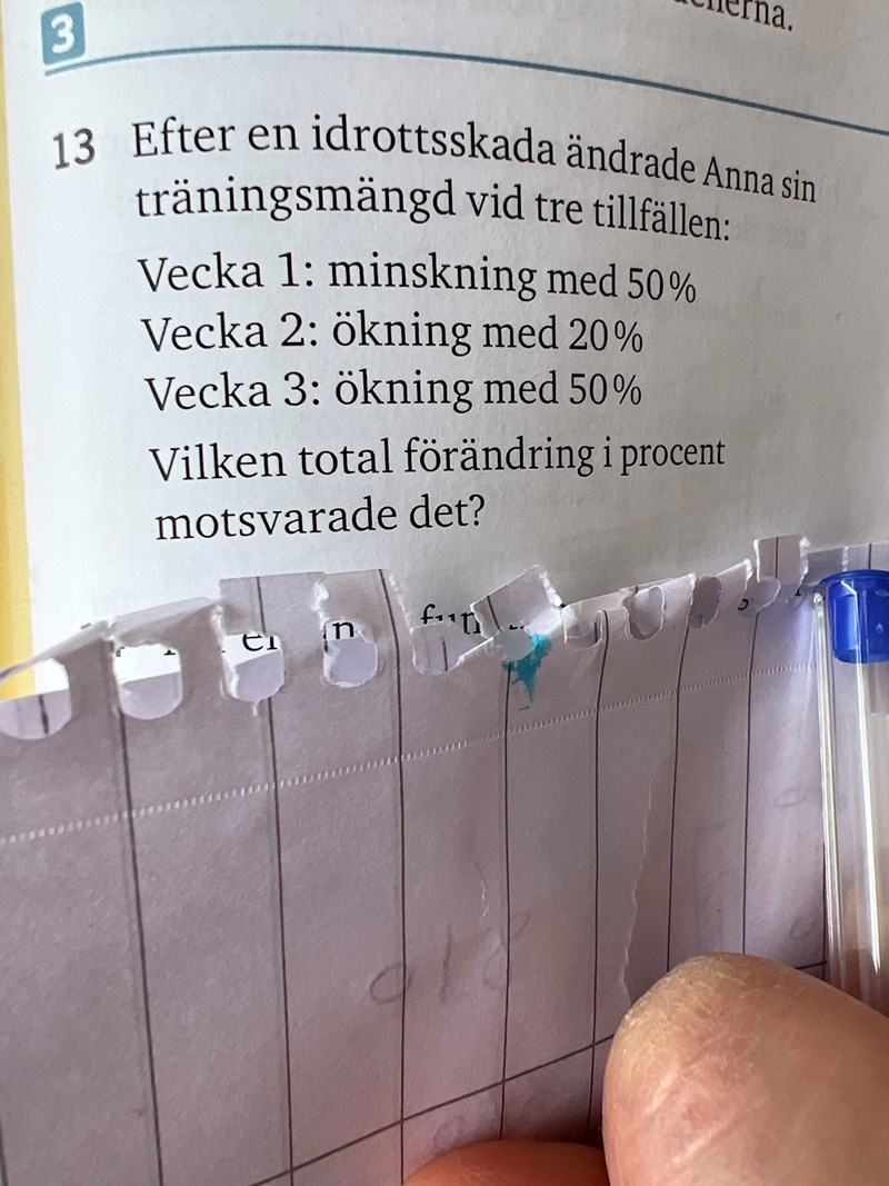 Säg att Anna tränar x timmar/veckan innan skadan. Kan du då skriva uttryck för hur mycket hon tränar vecka 1, 2 och 3?
