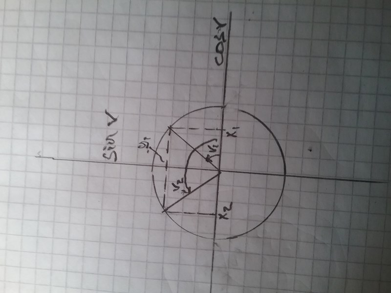 Sin(v1) ochb sin(v2) läser du av på y-axeln har samma värde, =0,8 i det här fallet. Cos(v1) och cos(v2) läser du av på x-axeln, följ de streckade linjerna ner till x-axeln. Det blir -0,6 resp +0,6 i det här fallet.