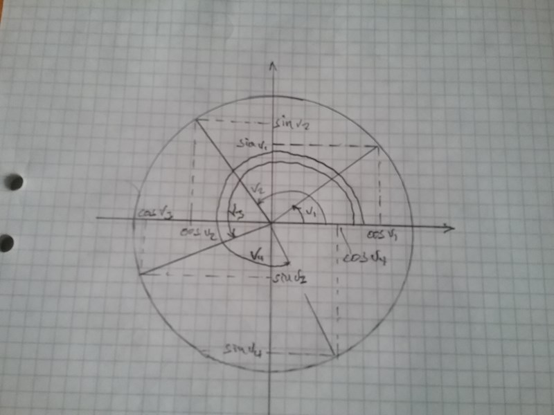 Sin(v3) och sin(v4) är båda negativa liksom att cos(v2) och cos(v3) är negativa.
