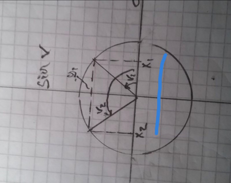 Som det är ritat så ligger v i första kvadranten men v kan vara så stor att den hamnar i andra kvadranten. Vilken vinkel är det då som blir 180-v ? (sin v ska fortfarande vara = 0,8)