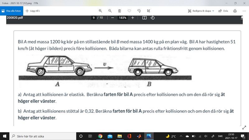 1200*51 = 1400*vb + 1200*va där vb är bil bs hastighet efter smällen och va hastigheten för bil a.