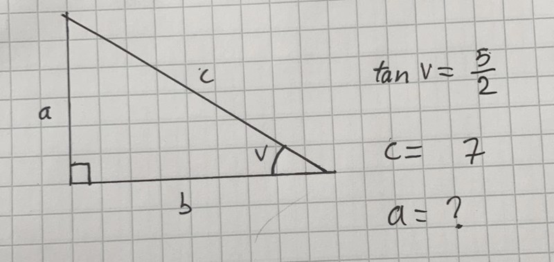 jag skulle vilka räkna ut en katet med hjälp av en vinkel samt en katet som är given. Jag har sida c=7 och tanv=5/2 och behöver räkna ut a. Som i bilden. Tips på hur kag kan börja? Jag tänkte först att man skulle kunna ta tanv=5/2 multiplicerad med 7 men det funkar ju inte