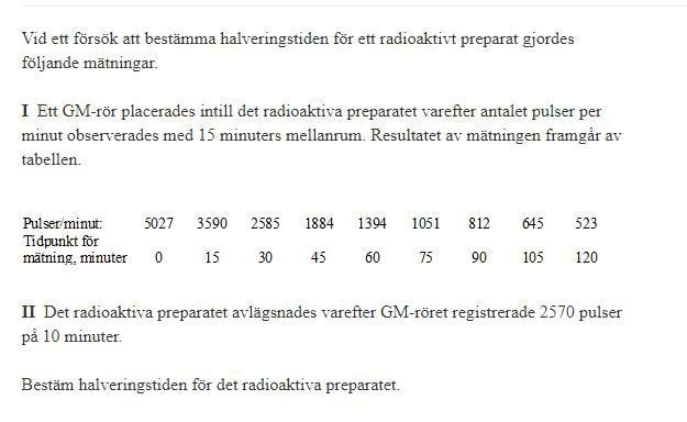 Dr. G skrev:Utan preparat registrerades 2750 pulser på 10 min. Det är bakgrunden som orsakar detta. Vad blir det på 1 min?