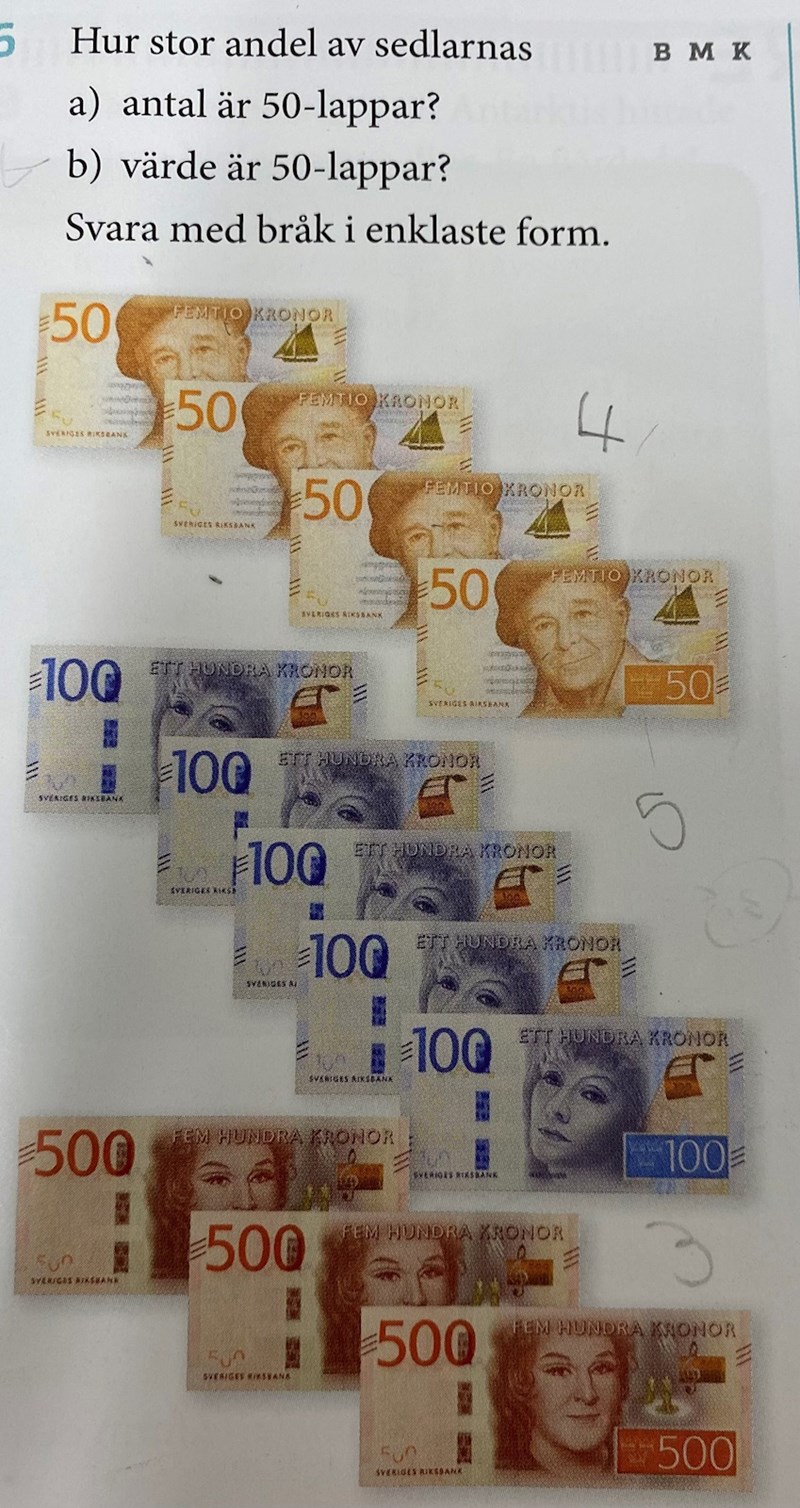 Räkna ut summan av alla femtiolappar i kr, räkna sedan ut den totala summan i kronor av alla sedlar inklusive femtiolappar.