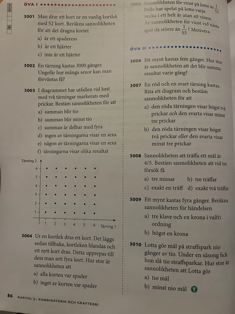 Hej, på uppgift 3007 b ska man använda sig av ett diagram som i uppgift 3003. Men om jag inte vill rita ut ett sådant diagram med prickar, hur gör jag då? Min lärare sa nämligen att det går med ett träd diagram men jag vet inte hur. Boken repeterar träddiagram i nästa avsnitt så antagligen tänker de på diagrammet med prickar.