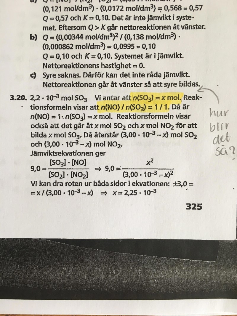 Här är facits förklaring. Jag förstår inte hur n(NO) / n(SO3) kan vara = 1/1 SO3 har ju liksom 2 mol och NO har 1 om jag inte misstar molförhållandena?