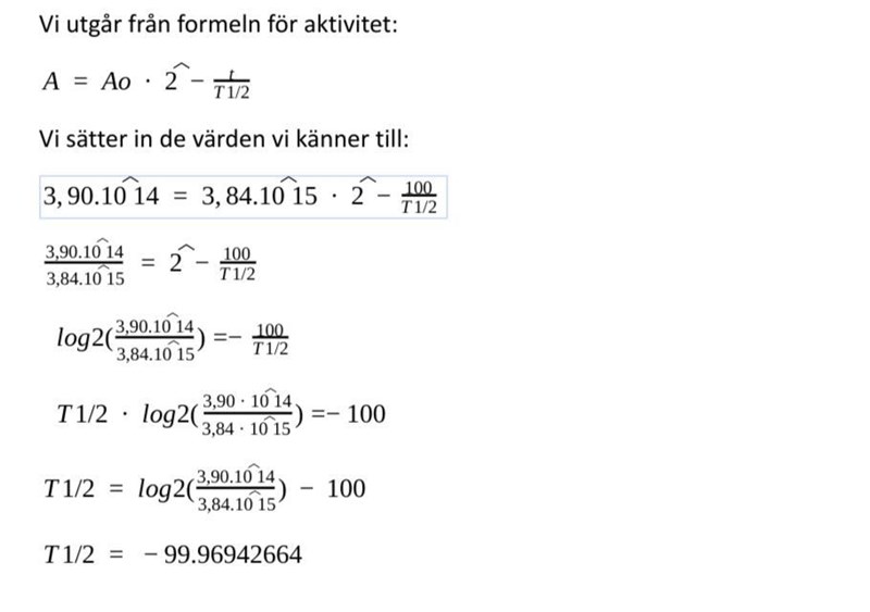 Ture skrev:Det verkar som om du inte läst uppgiften tillräckligt noga. Siffrorna som är givna gäller efter ett år och 100 år, därför får du dessa samband