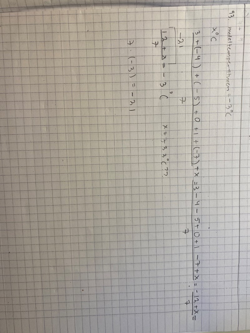Naturareee skrev:Ja du tänkte rätt! Det ska dock stå -12 i täljaren. Fortsätt genom att lösa ekvationen (-12+x)/7 = -3