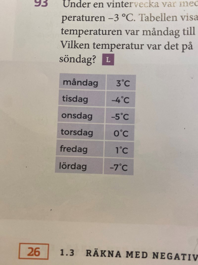 Under en vintervecka var medeltemperaturen -3 grader celsius. Tabellen visar vilken temperaturen var måndag till lördag.
