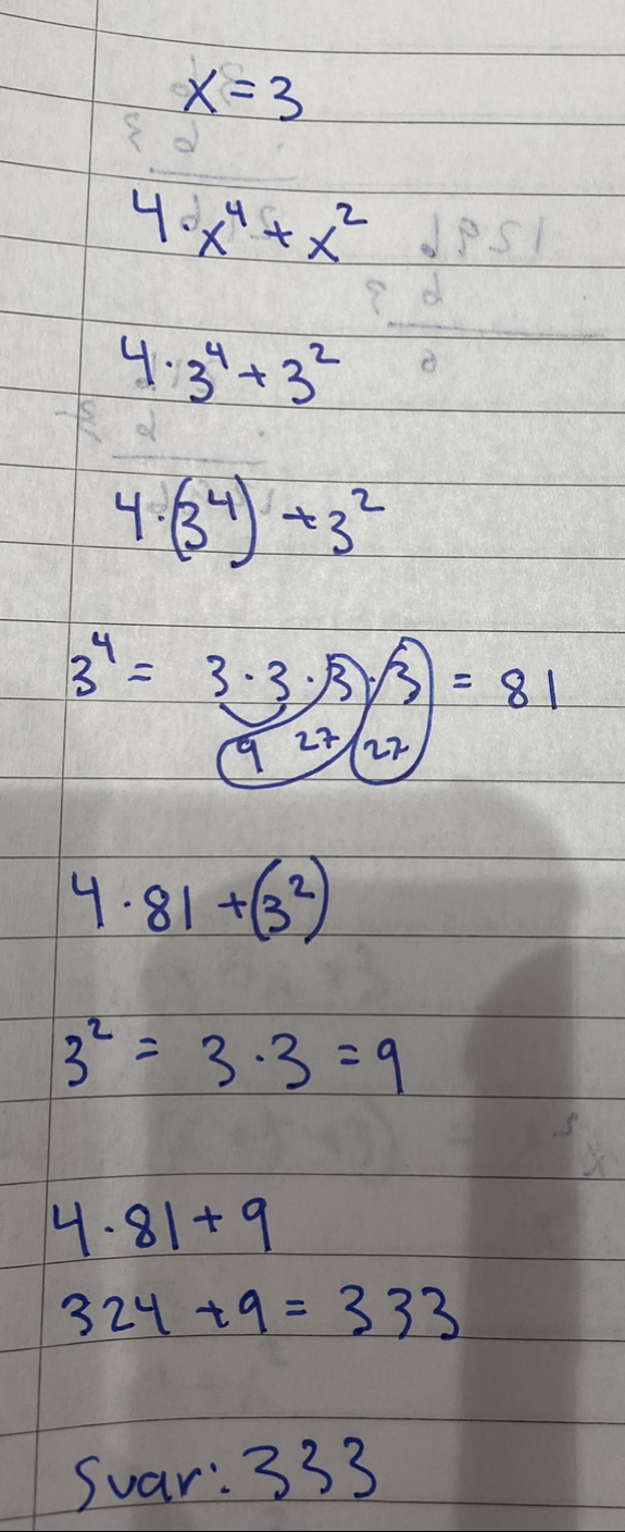 4•34 är inte lika med 124. Detta beror på att exponentiering har högre prioritet än multiplikation och alltså ska du först beräkna 34 och sedan multiplicera detta värde med 4.