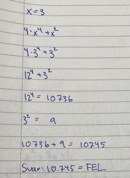 Jag har fotat frågan och även fotat min räkning och alla steg jag gör, dom ska finnas nedanför här. De är inte rätt oavsett vilket uttryck jag får att räkna ut, för jag liksom följer samma steg dvs jag gör på samma sätt, så jag gör ju något fel, men jag förstår inte riktigt vad, jag tycker jag gör som man ska.