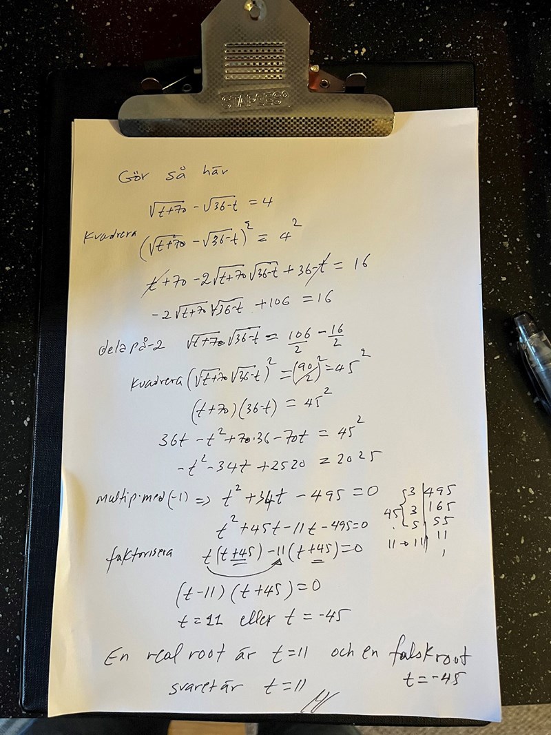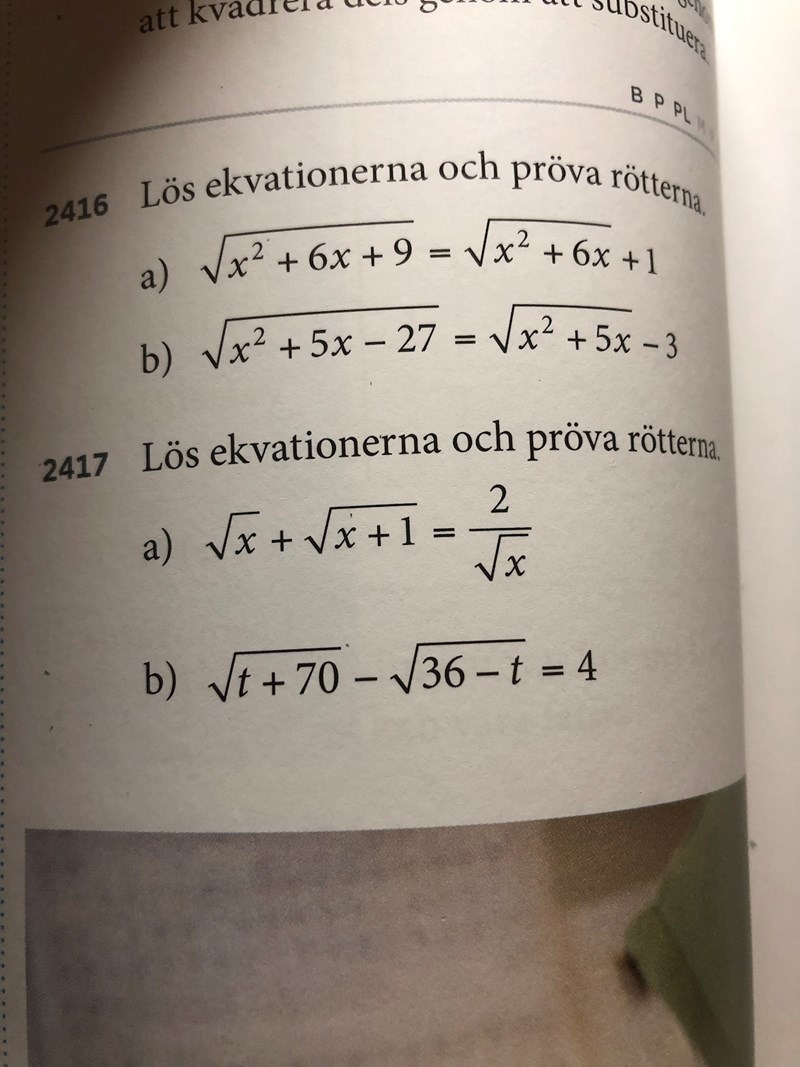 Hej, vet inte hur jag ska börja på 2417b. Jag kan ju flytta över roten ur (36-t) till VL, men känns inte som om det hjälper... Någon som har något tips på hur jag kan börja eller tänka? Tycker alltid att det blir svårt med rötter och inte virra bort sig med alla regler som finns...
