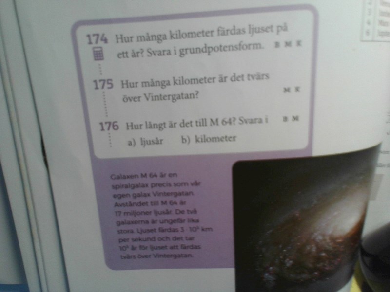 jag tänkte att multiplicera med 105 eftersom avståndet mellan vintergatan och M 64 är samma, så jag kunde då göra om det i kilometer. Men nu insåg jag att det är fel.