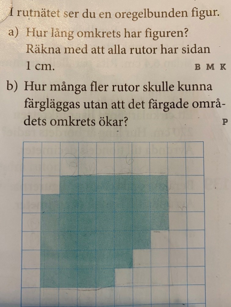 Jag tänker mig att principen de vill få fram är sambandet mellan omkretsen när det blir dessa ”trapp-liknande kanter” och när det skulle varit en fyrhörning med raka kanter. Om du istället för att följa de exakta linjerna tänker dig att du skapar en regelbunden fyrhörning, blir omkretsen annorlunda då? (På så sätt vet du hur du tar dig an liknande uppgifter)