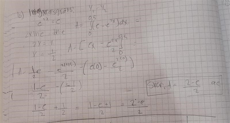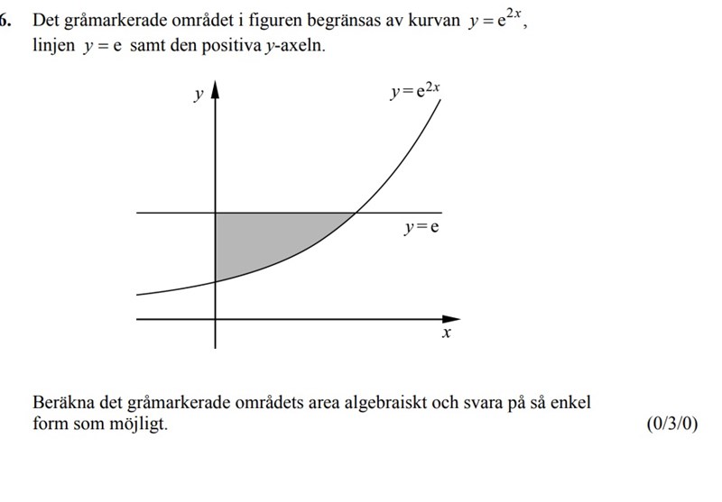 Du kan även göra som facit, räkna på arean under e^(2x) mellan 0 och 1/2 och subtrahera detta från rektangeln med basen 1/2 och höjden e.