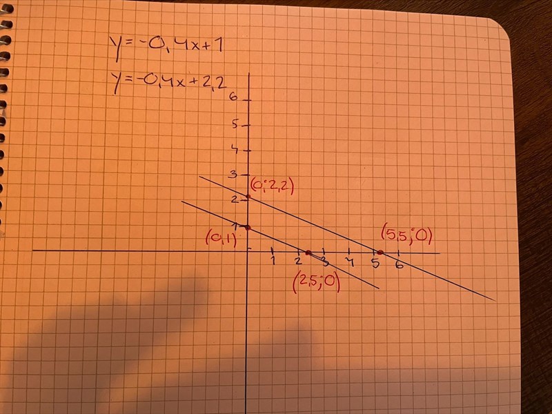 Frågan lyder : En linje går genom punkten (3, 1) och är parallell med en annan linje 0,8x + 2y – 2 = 0. De båda linjerna begränsar tillsammans med koordinataxlarna ett område. Beräkna detta områdes area.