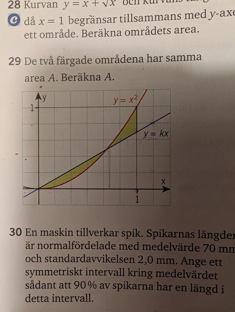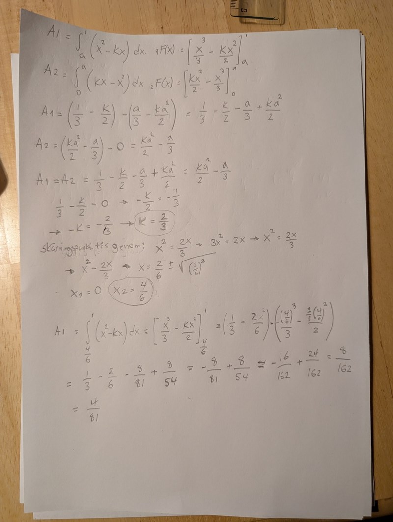 Eller, ja. I och med att man sätter areorna lika med varandra så kan man på så vis hitta det enda x värde som gör detta sant? Och då även k då..