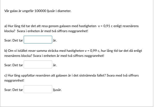 a) Ur rymdresenärens perspektiv kan vi se det som att vintergatan rör sig med hastigheten v = 0.9c medan man själv står stilla och objekt som rör sig med hastigheten v komprimeras med faktorn √(1 - v²/c²) = √(1 - 0.9²) ≈ 0.436. Med andra ord är galaxen 100000*0.436 = 43600 ljusår i diameter. Tiden det tar att färdas från ände till ände blir då t = (43600 ljusår)/(0.9c) = (43600 c)/(0.9c) som blir då: