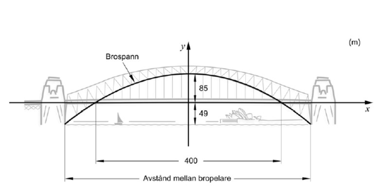 En av sevärdheterna i Sydney är den stora stålbron, Sydney Harbour Bridge. Mellan bropelarna löper ett brospann som har formen av en andragradskurva. Den högsta punkten är belägen 85 meter över vägbanan. Vägbanan ligger i sin tur 49 meter över vattenytan. Brospannet befinner sig ovanför vägbanan längs en 400 meter lång vägsträcka. Se figur.