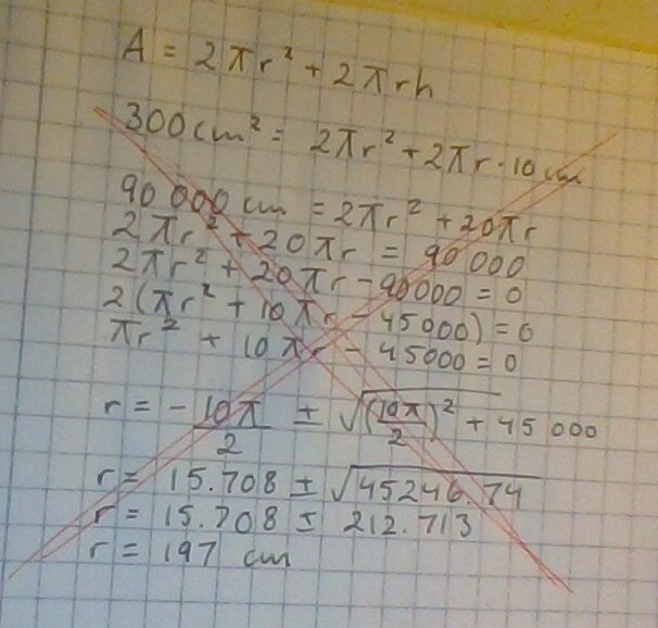 Uppgiften lyder "Begränsningsarean av en rak cirkulär cylinder beräknas med formeln A= 2πr² + 2πrh. Bestäm r, om A = 300 cm² och h = 10 cm."