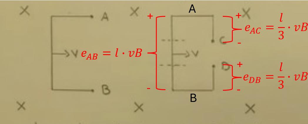 Titta på nedanstående figur.  Spänningarna eAB, eAC och eDB induceras, enligt generatorformeln, när ledaren rör sig i magnetfältet.