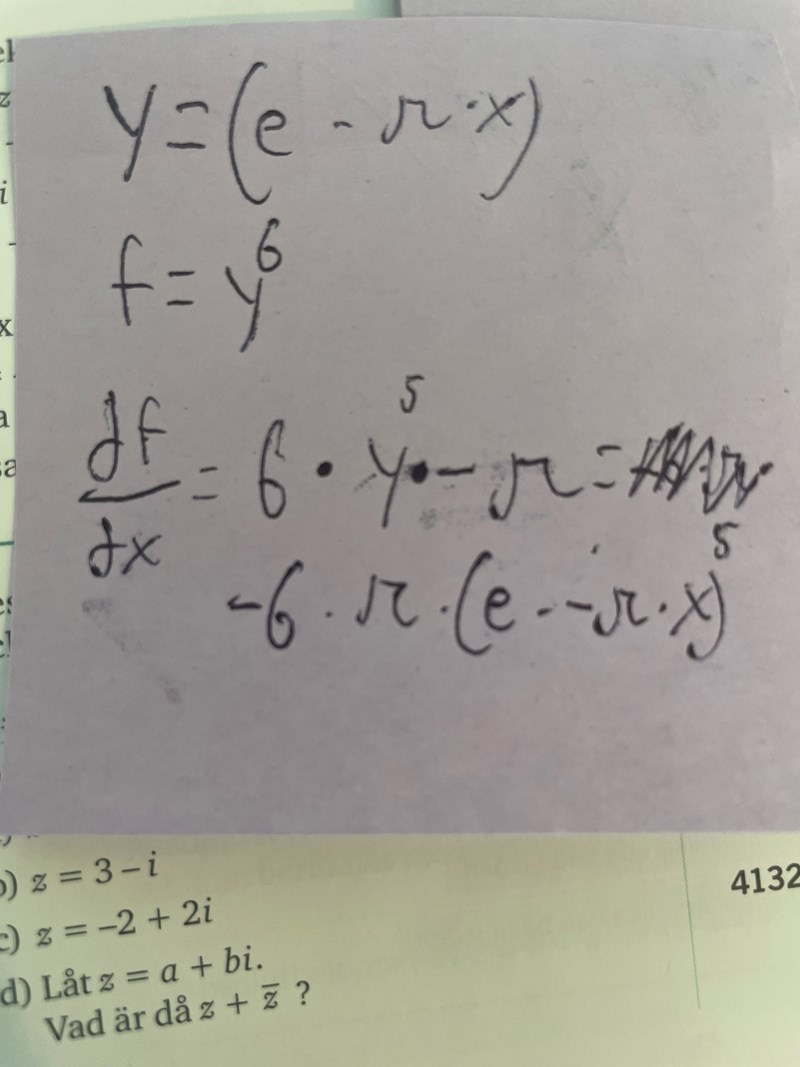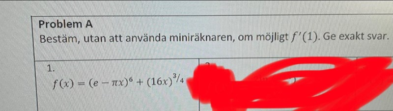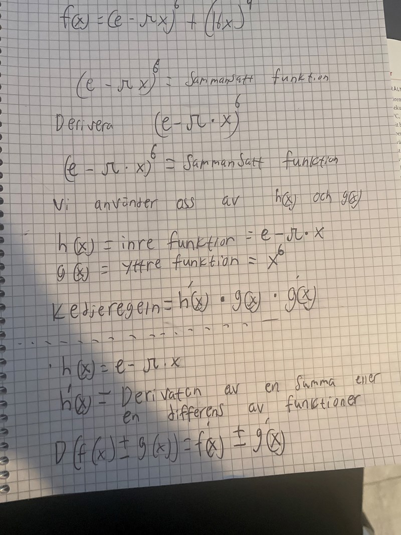 Jag tänker att jag börjar derivera första funktionen då (e - pi * x)^ 6. Har jag gjort rätt här? Eller är jag helt ute och cyklar?