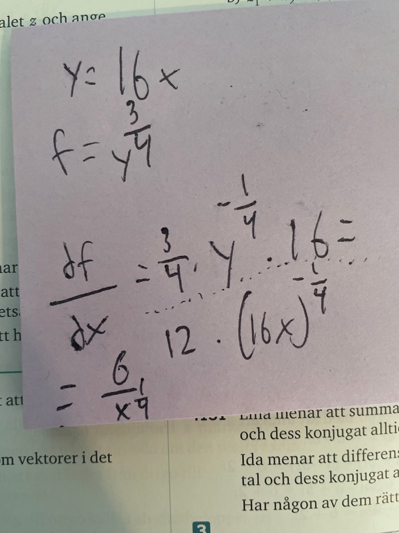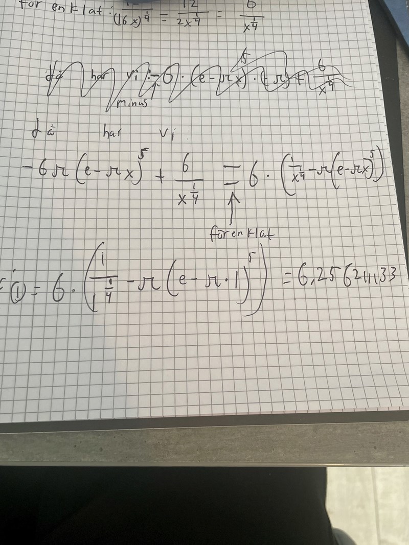 Sätt y = (e-pi*x) och f = y6. Då är df/dx = df/dy*dy/dx = 6*y5*-pi = -6*pi*(e-pi*x)5. Sätt y = 16x och f = y3/4. Då är df/dx = df/dy*dy/dx = 3/4*y-1/4 *16 = 12*(16x)-1/4 som sedan kan förenklas som Yngve redan visat.