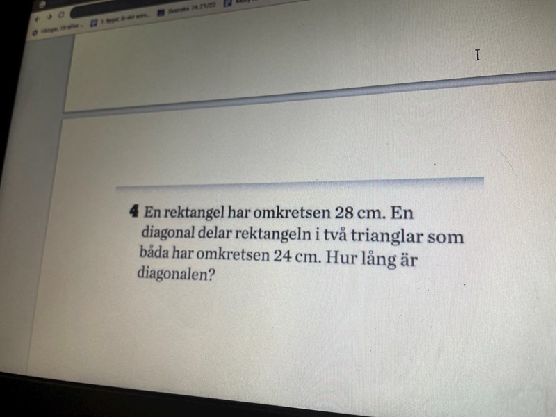 Om vi nu kallar diagonalen c så vet vi att omkretsen av en triangel är a+b+c = 24. Eftersom vi vet att a+b = 14 får vi: 14 + c = 24.