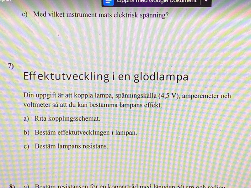 ”Din uppgift är att koppla en lampa, spänningsskälla (4,5V), amperemeter ock voltmeter så att du kan räkna ut lampans effekt.”
