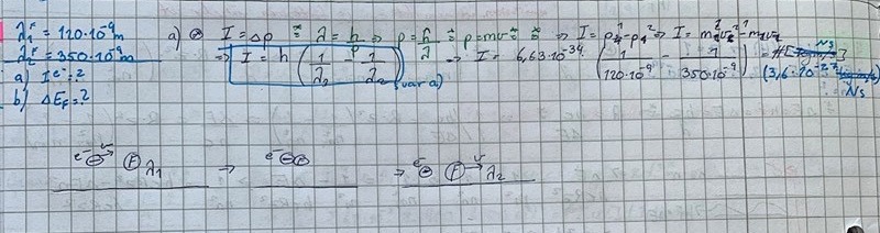 Jag har löst frågan och den blev rätt men kom på att jag inte fattar vad jag räknar ut. Varför är det jag räknar ut elektronens impuls? Eller är elektronens och fotonens impuls samma? Tänker att det borde vara fotonens impuls som jag får i uträkningen.