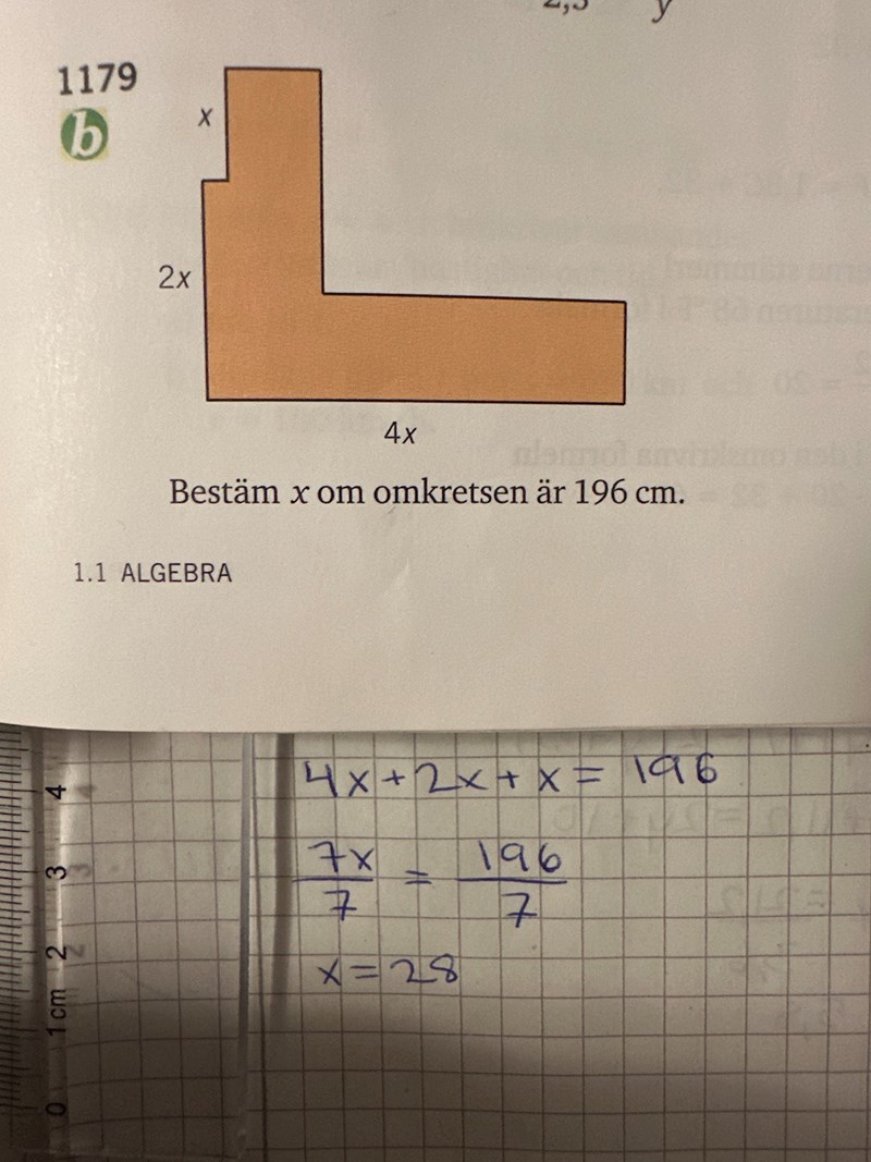 Hej! Svaret på denna ska bli 14 cm, summan av de två höger sidorna är 3x. Hur räknar jag ut detta? Har jag gjort korrekt?