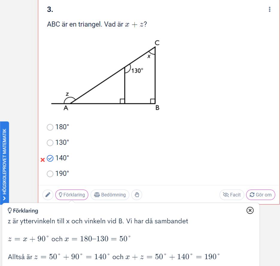 Hur kom de fram till att x=180-130=50? Borde det inte vara 360-130-90?