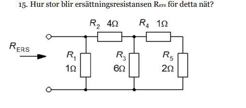 Tack så mycket herr Engineering och Dr. G! Jag kom fram till att R5 och R4 = 3 ohm, och parallellt kopplad med R3 blir den 2 ohm. Ersättningsresistorn är kopplad i serie med R2, och blir därför 6 ohm, som sedan är kopplad parallellt med R1. 1/1 + 1/6 = 7/6. Inverterat 6/7 ~ 0,86 ohm.