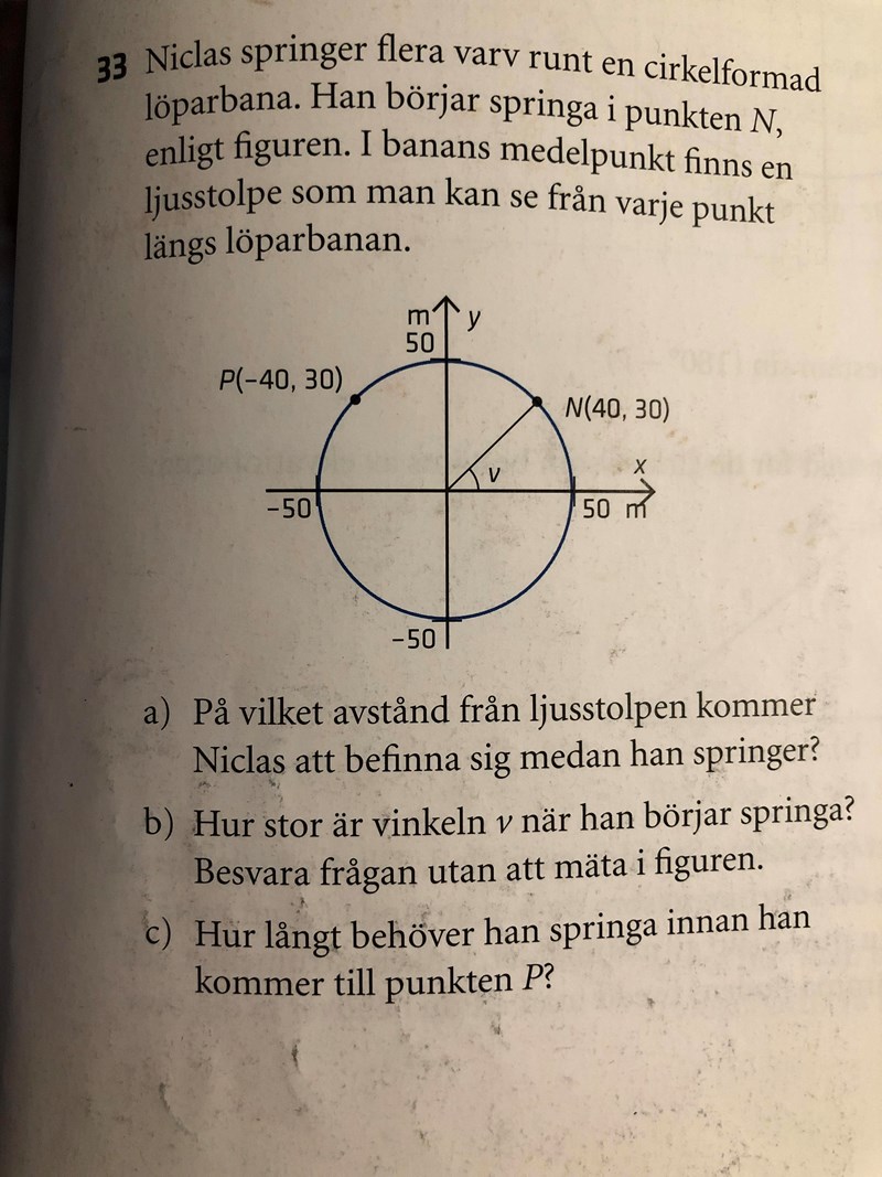 Hur långt är ett helt varv? Och hur stor blir vinkeln v då? Och hur stor är vinkeln mellan N och P (förstår själv inte riktigt om de menar att han springer med- eller moturs dock)?