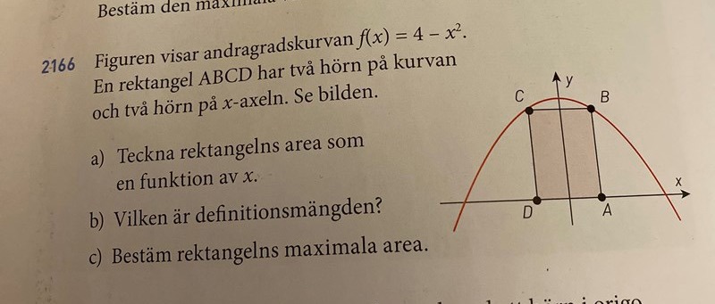 Förstår fortfarande inte hur man får höjden på rektangeln. Efter att ha kollat i facit har jag förstått att långsidan av rektangeln måste vara (4-x) men jag förstår inte varför, snälla hjälp