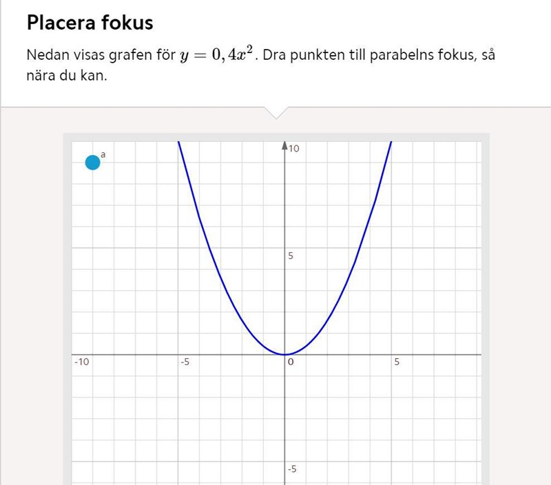 Ja, det är formeln y=x24t jag pratar om, där t är fokuspunktens y-värde (x-värdet måste vara noll för att funktionen ska fungera). Vår funktion ges av y=0,4·x2. Om vi sätter in 0,4·x2 istället för y i formeln, kan vi räkna ut t: