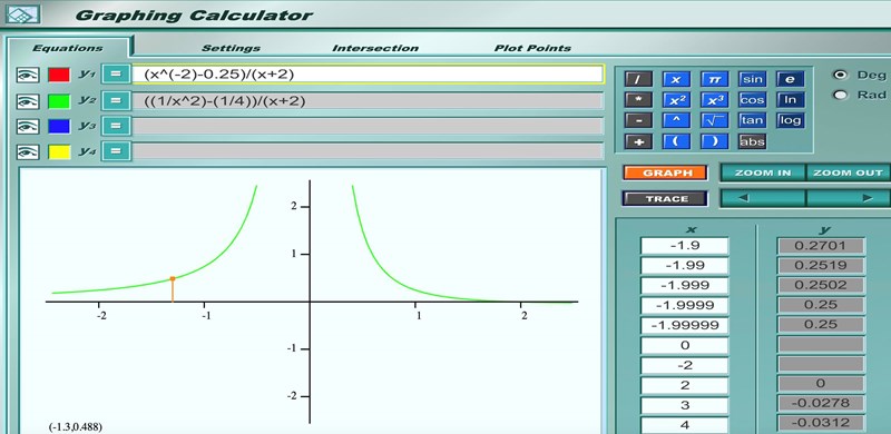 Grafen har inte ett värde vid (y-rutan blir ju tom!). Däremot kan du se att gränsvärdet vid inte går mot oändligheten som det gör vid .